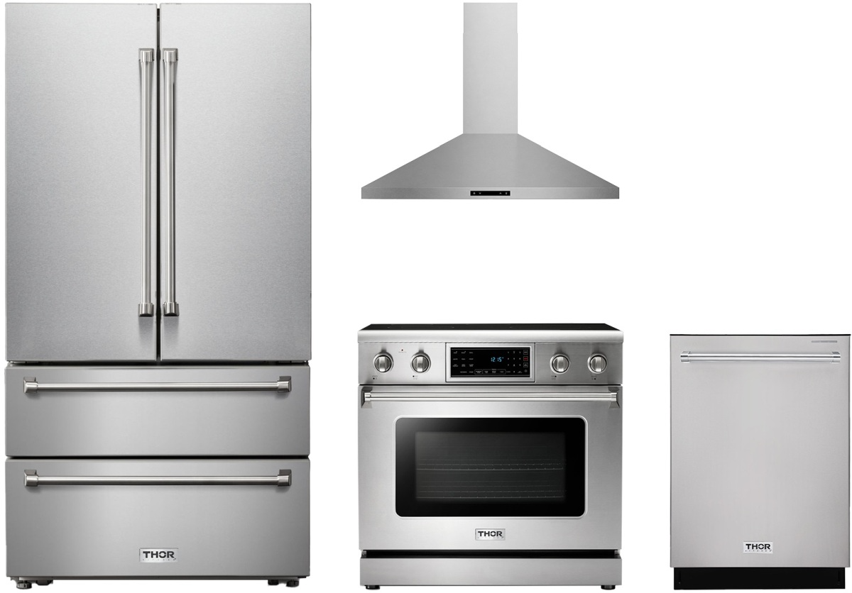 Thor Kitchen® 4 Piece Stainless Steel Kitchen Package with a freestanding electric range, French door refrigerator, built in dishwasher and wall mounted range hood.Read More